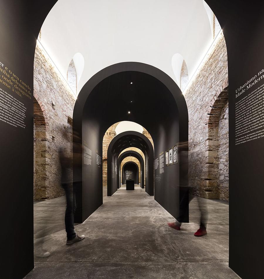 The museum is housed in the restored Church of our Lady of the Valley. The architects decided to give the beautifully aged brick walls their due prominence and kept the exhibit panels away from them by creating a simple tunnel with a series of black arches.