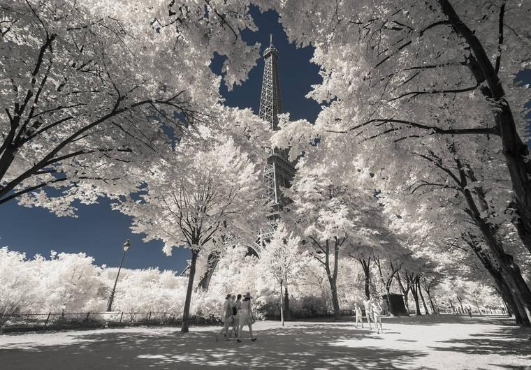Infrared photography gives Paris an otherworldly makeover. In these hauntingly beautiful images, familiar sights like the Eiffel Tower and city parks appear bathed in soft pinks, whites, and luminous tones.