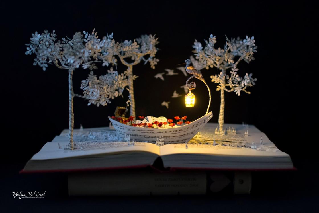 Transforming old books into poetic compositions, this is the idea of artist Malena Valcarcel. This Spanish artist illustrates classic stories for children, using the pages of old books to create miniature dioramas. Some sweet and adorable creations of paper art, which give a new life to these forgotten books.